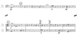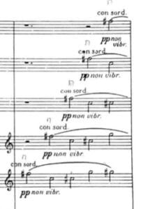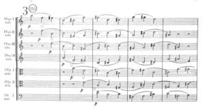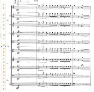 A l’inverse du 1er mouvement qui débutait avec douceur ici il commence par un unisson de tous les instruments qui jouent avec une nuance extrême les 12 notes de l’écriture dodécaphonique. Suivent ensuite les 5 notes de transition